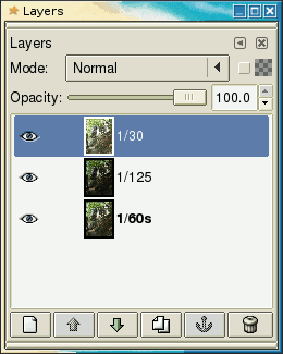 img/krok1-01-vrstvy_small.png Otevřete v Gimpu všechny tři obrázky. V "normálně" exponovaném (tj. 1/60s) obrázku vytvořte další vrstvy (pravá myš -> Layers -> New Layer) a do nich vkopírujte zbylé dvě fotky. Vrstvy vytvářejte průhledné. Díky tomuto postupu zůstanou zachovány EXIF informace z fotografie, z níž bude výsledek obsahovat nejvíce dat. Já osobně si vrstvy pojmenovávám podle expozičního času. Až skončíte, zavřete zbylé dvě fotografie. Paletka s vrstvami (CTRL+L, pravá myš -> Dialogs -> Layers) by měla vypadat tak, jak ukazuje obrázek.
