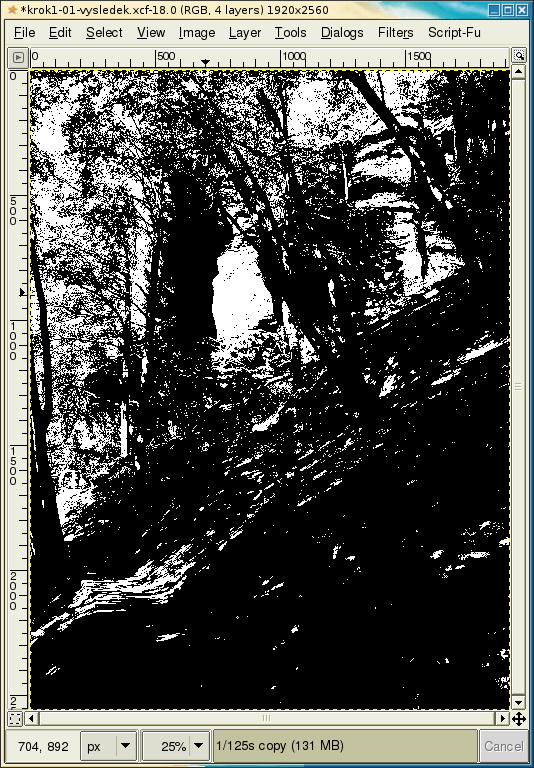 img/krok2-01-ApplyTreshold_small.png img/krok2-02-mask1_125_small.jpg V tomto kroku vytvoříme masky, pomocí nichž budeme z jednotlivých snímků vybírat to, co se nám hodí. Z "tmavé" expozice 1/125s si vezmeme světlé oblasti a ze "světlé" si vezmeme stíny k prokreslení některých až příliš tmavých stínů v 1/60s.