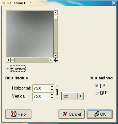 Rozmažeme ji funkcí Gaussian Blur (pravá myš -> Filters -> Blur -> Gausian Blur). Nebojte se použít velké hodnoty poloměru, 25 je minimum. Pro tento případ jsem experimentováním došel až k 75.