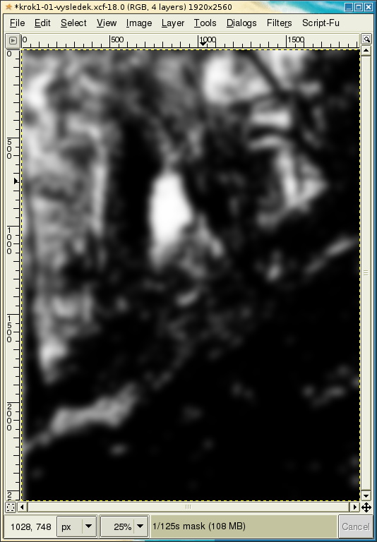 Zkopírujte si do zásobníku tuto vrstvu (CTRL+A a CTRL+C). V paletce vrstev pravým tlačítkem myši klikněte na vrstvu 1/125s a zvolte "Add Layer Mask" s nastavením "White (full opacity)". Vedle náhledu vrstvy se objeví bílý obdélníček. Vložte obsah zásobníku do masky (CTRL+V). Okamžitě uvidíte, že vypálené oblasti tmavnou, ale asi si všimnete, že jsou takové nějaké divné. Zvětšení prozradí, že jsou tam jakési mapy - maska je totiž příliš ostrá. To lze naštěstí snadno napravit.